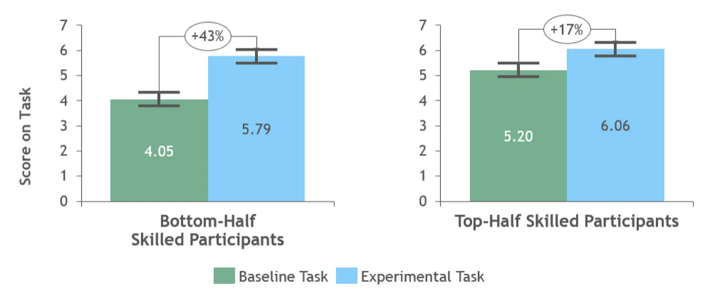 Impressive results, but the impact wasn’t evenly distributed. In both cases, the lowest-performing workers improved the most. Novice and low-skilled customer support agents saw a 35% improvement compared with minimal impact on high-skilled workers. In the second study, all consultants benefited from AI, but above-average performers only improved by 17%, whereas below-average performers improved by a whopping 43%.